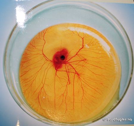 - Tjuende dag: Eggeplomme-sekk fullstendig trukket inn kroppens hulrom; fosteret tar praktisk talt hele plassen inne i egget unntatt luftcellen